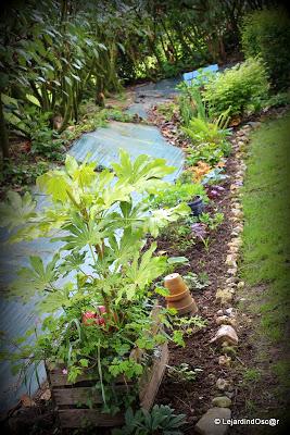 C'est une partie essentiellement plantée de petits rejetons du jardin (sédum, heuchères, boutures d'hydrangeas) qui ne demandent qu'à pousser, de quelques nouveaux spécimens aussi, comme,