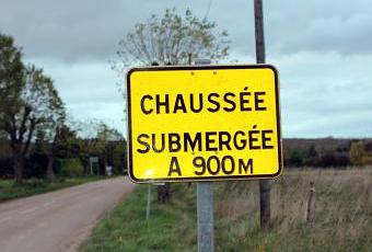 Cette crue de la Seine ne semble intéresser personne, on croirait que je rêve. Pourtant France 3 Champagne Ardennes a osé en parler et a interviewé un agriculteur de l'Aube que nous avions vu lors de la crue précédente. Ils nous ont montré son champ bien plus inondé que mon terrain. Le pauvre homme a perdu toute sa récolte au printemps et maintenant son maïs est dans l'eau au moment où il devrait être récolté. Il a osé dire ce que je pense : le niveau de la Seine est régulé grâce aux grands lacs de retenue mais uniquement dans le but de maintenir un niveau suffisant pour la centrale de Nogent et un niveau bas pour Paris sans penser un instant aux conséquences pour les agriculteurs et les villes. Car les villes ne sont pas épargnées même si on fait semblant de ne rien voir. Voici la pancarte qui se trouve en ce moment sur la petite route qui part de la N19 et mène à Marnay sur Seine, peu avant la pancarte d'entrée du village :