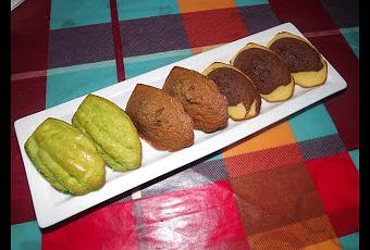 Diviser le mélange en 4 portion, parfumer chaque partie avec : jus et zestes de citron, cacao, café et thé matcha. Placer le mélange au frais pendant au moins 1 heure (de préférence deux ou trois heures). Cette étape est primordiale car c'est le choc thermique entre le four chaud et la pâte froide qui va former la bosse des madeleines. Beurrer et fariner les moules à madeleines et remplir au 2/3. Chauffer le four à 230°, une fois cette température atteinte, enfourner , baisser la température à 200° et faire cuire 4 minutes. Baisser ensuite à 180° et faire cuire pendant 4 minutes supplémentaires (toujours sans ouvrir le four). Attendre quelques minutes ,démouler et laisser refroidir sur une grille.