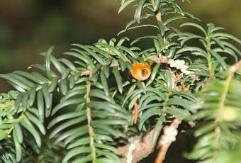L'an dernier à Marnay j'ai trouvé en me promenant dans le jardin une petite branche d'if tombée au sol. J'ai vu l'if dont il provenait. Très à l'ombre, pas très beau, je ne l'aurais peut-être pas remarqué sans cette petite branche au niveau du chemin. Il ne portait aucun fruit mais l'étiquette laissait supposer une femelle avec des fruits jaunes. Je ne savais pas jusque là qu'un if pouvait avoir des fruits jaunes. J'ai gardé la petite branche et je l'ai mise dans un pot.