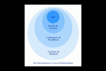 Cela consiste en plusieurs ovales concentriques (centrées sur le sujet) qui illustrent comment la confiance a tendance à diminuer quand on se dirige vers l'extérieur. C'est çà, en nous éloignant de nos proches, nous nous méfions d'avantage. Généralement, ces « cercles de relations » sont définis par l'interdépendance , le partage des connaissances et la confiance.Ils comprennent :