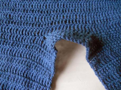 Il y a près de deux ans, j'avais fait un "poncho-écharpe-châle" ici d'après un modèle en U (dans le livre "mon cours de crochet en 25 leçons).Mais le col m'embêtait un peu, je ne le trouvais pas très agréable.J'avais envie d'un col qui couvrait la nuque.J'ai décrocheté et recommencé pour avoir un col montant.