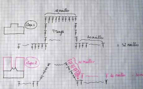 2e étape : on repart du grand rectangle jusqu'au petit rectangle (20 mailles) et on pique les doubles brides sur les côtés du petit rectangle (10 mailles). On tire un peur sur le côté pour se faciliter le travail. Et ensuite on continue jusqu'à la taille voulue. (= 30 mailles en tout).