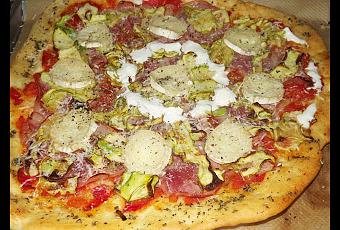 Travailler la pâte encore quelques minutes, la couper en deux ou en trois selon la taille de vos pizzas. Étaler sur une épaisseur de quelques mm. Dans le presse ail , mettre les câpres et l'oignon et presser sur la pâte uniformément. Cela permettra d'avoir le goût du câpre et de l’oignon sans avoir des morceaux complets. Recouvrir la pâte avec la sauce tomate, les lamelles de courgettes, de jambon et de chèvre. Enfourner dans un four très chaud pendant 8m environs. Sortir la pizza , parsemer d'emmental rappé , remettre au four quelques secondes pour que l'emmental fonde. la sortir de nouveau, badigeonner les bords avec de l'huile d'olive , parsemer le reste d'origan et mettre un peu de crème fraiche au centre.