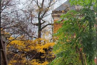 Un Ginkgo biloba femelle se trouve de l'autre côté du jardin, dans une zone gardée volontairement sauvage et où il n'est possible d'entrer que sur rendez-vous. Je ne peux photographier l'arbre en entier parce qu'il est en grande partie caché par d'autres arbres. Les deux premières photos sont du 4 décembre 2010 quand il était moins caché, les suivantes sont du 1 décembre 2013 :