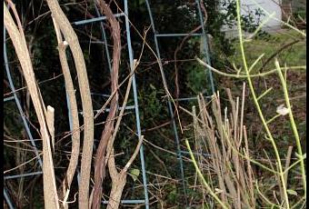 J'ai alors vu des très grosses branches qui couraient au sol, se tortillant en tous sens sur plusieurs mètres. J'ai réussi à les installer sur les arches en les faisant monter et descendre. J'espère que, comme pour les rosiers, la floraison sera plus abondante dans ces parties descendantes. Il y a surtout 2 très grosses branches, presque aussi grosses que le tronc : l'une courait au sol au pied du tronc de hêtre, l'autre partait vers l'ouest, dépassant le sureau blanc :