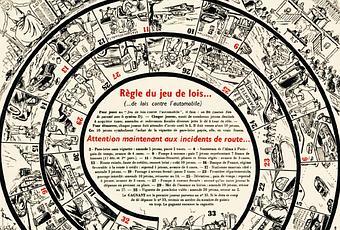 C’est dans ce contexte que j’aimerais vous montrer cette Une du journal L’Argus rapporté dans le livre La cote Argus, 85 ans d’histoire aux éditions de l’ACA. Le spécialiste de la cote automobile depuis 1927 a édité 30 ans après son lancement une Une qui traite avec un humour plus que grinçant l’actualité contemporaine. Cette Une, parue le 3 janvier 1957 dans L’Argus de l’automobile et de la locomotion présente un jeu de l’oie peu commun, puisqu’il s’agit d’un Jeu de Lois.