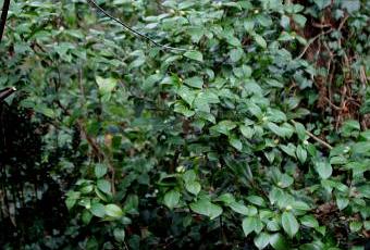 Camellia japonica 'Mme Martin Cachet' a une fleur sur une branche basse, presque au ras du sol et un bouton bien rouge un peu plus haut. Il a 28 ans et ne grandit presque plus, il est à la fois dressé et très large. A gauche on voit un fragon avec 3 fruits. il est planté au nord assez près de la maison. Il est très florifère comme vous le verrez bientôt.