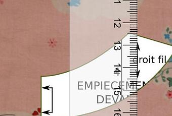 Aligner le mètre avec le droit fil au dessus et en dessous de la pièce du patron puis faites bouger celle-ci jusqu’à ce que la flèche du droit fil soit alignée avec le mètre.