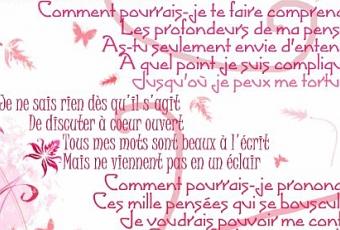 Voici deux versions graphiques de mon poème Comment te dire, l'une datant de 2008 et l'autre de 2014. À part ma meilleure maîtrise des outils (à l'époque sans doute Paint Shop Pro, maintenant Photoshop), vous constaterez que j'ai aussi beaucoup simplifié (polices, décos...) pour améliorer la lisibilité.