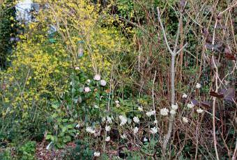 Vous connaissez déjà les feuilles rouges de l'Hydrangea quercifolia qui tomberont à la poussée des bourgeons; les fleurs devenues blanches de l'Edgeworthia qui donne le spectacle depuis des mois, le Camellia 'Désir' au grandes fleurs doubles rose très pâle. Il y a maintenant aussi un camellia à fleurs rouges