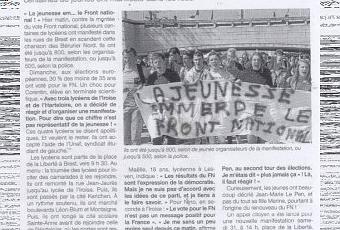Tout ce bruit provoqué par les derniers délires du vieux leader néo-nazi me donne l’occasion de faire une petite mise au point sur un article paru dans la presse locale brestoise il y a une semaine et demie. La veille, avait eu lieu une manifestation anti-FN organisée à l’initiative de lycéens brestois et encadrée par l’UNEF. Votre serviteur était dans le cortège et avait répondu aux questions d’une journaliste ; le lendemain, je pris donc tout naturellement la peine de prendre connaissance de l’article consacré à ce salutaire sursaut citoyen de la jeunesse brestoise et je vous invite à en faire autant :