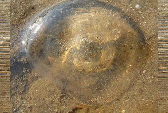En errant sur l’estran, je suis tombée sur une méduse de couleur "goutte d’eau", complètement transparente. S’agit-il d’une espèce à part ? d’une anomalie génétique d’une aurélie lambda ? j’ai envoyé le signalement de la bête à "Opération Méduses", on verra bien …