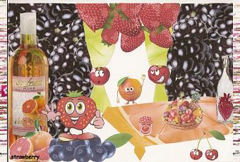 J'ai choisi le thème des fruits car je trouve le thème très varié et coloré. J'ai réalisé un genre de nature morte avec un brin de fantaisie et d'humour. Au milieu j'ai fait des rideaux avec a texture du citron vert, la nappe de la table avec la texture d'orange. Et le mur avec le fruit " la mûre ".