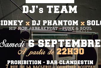 SMELLS EVENTS & PROHIBITION - LE BAR CLANDESTIN présentent la «SMELLS DJ’s TEAM» avec SIDNEY célèbre présentateur de l'émission «H.I.P. H.O.P.» sur TF1 en 1984, le talenteux DJ PHANTOM et SOLO ex membre fondateur du groupe mythique ASSASSIN.