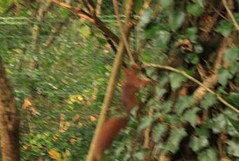 Pourtant ils sont toujours là, sur leur arbre préféré au ras d’une fenêtre du séjour, celui à partir duquel ils viennent m’observer. Je n’étais pas là lorsque cela s’est produit mais ma belle-fille et mes petites filles étaient dans le séjour lorsque l’écureuil s’est montré sur l’arbre. Elles ont vu pour la première fois un écureuil roux, pas un écureuil américain agressif, le seul qu'elles connaissaient. Mes petites filles ne pouvaient s’arrêter d’en parler. Les photos ont été prises par ma belle-fille. La première est un peu floue, elle n’a pas eu le temps de faire mieux. La deuxième montre la magnifique queue opulente et bien rouge.
