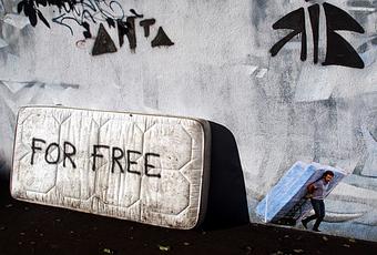 Mobilier urbain (matelas) et collage au mur...
