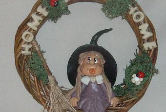 Couronne en osier décorée de mousse d'islande et sujet réalisé en porcelaine froide