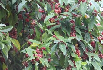 J’ai pensé que cette plante est, comme beaucoup d’arbres fruitiers, autostérile. En effet, j’ai 3 Elaeagnus umbellata, probablement tous du même clone. Ils ont fleuri pour la première fois en 2010, donc pour la 5ème fois cette année et n’ont jamais donné de fruits. On me dira que certains fruitiers mettent 10 ans pour produire. Mais il y a celui du Jardin Botanique de Marnay sur Seine. Il est beaucoup plus vieux, beaucoup plus grand, la forme et le taille d’un arbre. Il fleurit magnifiquement et je ne lui ai jamais vu le moindre fruit. Quelle autre explication peut-on donner que l’autostérilité ?