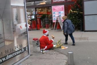 Logique et normal me direz-vous. Oui, sauf que (ah ! vous voyez, encore un « sauf que » !), au lieu d’un Père Noël grand et fort, paradant en tenue au milieu des badauds, savourant son quart d’heure de gloire saisonnière, mon pépère n’avait guère fière allure. Quand on s’attendrait à le voir distribuer cadeaux ou friandises, le malheureux en était réduit à mendier, bien heureux d’avoir pu s’offrir un sandwich.