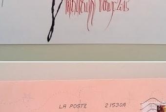 J'ai la chance ( et un très grand plaisir) de recevoir chaque année dans ma boîte aux lettres de nombreuses cartes de vœux toutes plus belles les unes que les autres. Les habitués de ce blog savent déjà que je les publie et vous nouveaux visiteurs, allez découvrir un festival d'art postal. Je commence avec Claudie Barreau qui me précise qu'un stage de monocondyle* avec Sophie Verbeek entraîne des vœux illisibles.... mais graphiquement séduisants.