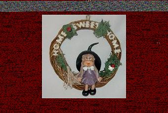 Couronne Home sweet home avec Sorcière assise sur son balai ... entièrement réalisée à la main et en porcelaine froide ... modèle unique... Couronne en osier décorée de mousse d'islande réf:7582 30 € st ock dimension: 15 cm diamètre coloris: noir/aubergine réf:7581...