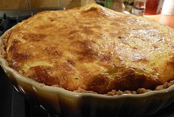 La pâte pâte brisée : 7 à 8 cuillerées à soupe très bombées de farine type 55, un jaune d'oeuf et une pincée de sel, 3/4 d'un sachet de levure chimique, 5 à 6 cuillerées à soupe d'huile neutre, un demi verre d'eau. On mélange sans trop pétrir. Pas de problème si la pâte reste grumeleuse dans la mesure où on la tassera - après deux bonnes heures de repos au frais - directement avec les doigts dans la tourtière.