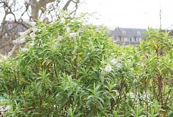 Décomplexée par les constatations anglaises, je vais continuer à vous montrer des plantes anormalement en fleurs en janvier. En voici une superbe, une véronique arbustive d'environ 1m40 de hauteur au Jardin des Plantes de Paris. Elle est persistante et sa date de floraison habituelle est juin-juillet. C'est Hebe traversii :