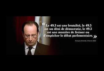 «Le 49-3 est une brutalité, le 49-3 est un déni de démocratie, le 49-3 est une manière de freiner ou d’empêcher le débat parlementaire», avait déclaré François Hollande en février 2006 lorsque le Premier Ministre voulait recourir à cet article. Il est vrai qu’il s’agissait d’un gouvernement supposé de droite dirigé par Dominique de Villepin sous la présidence de Jacques Chirac.