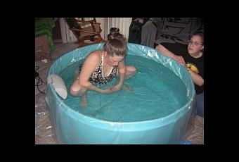 Mais là, tandis que tout le monde s’affairait et que l’horreur de la situation me frappait en pleine face – j’allais devoir entrer dans cette piscine et souffrir – je n’osai pas crier au malentendu (« STOOOOP !! Arrêtez tout !! J’avais pas tout compris !! Je vais sur la table, je veux la péridurale ! »). Non, au lieu de ça, j’ôtai l’horrible robe de chambre de l’hôpital et m’apprêtai à entrer dans la piscine gonflable. A ce moment-là, la sage-femme proposa d’aller chercher mon tee-shirt. J’avais déjà tellement mal que je m’en foutais d’accoucher en soutif, tant pis, c’était trop d’effort de me changer. Elle offrit également de brancher mon MP3 mais soudain j’étais incapable d’entendre le moindre son (c’était bien la peine d’avoir téléchargé des musiques de relaxation exprès !).