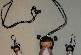 Parure kokeshi avec collier chaine et boucle doreille assortie, réalisé en porcelaine froide et entièrement modelé à la main