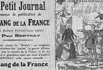 Les journaux publient chaque jour des épisodes de romans. Pendant la guerre, ces œuvres inégalement littéraires, évoquent le conflit, les familles déchirées, l’héroïsme des soldats … Le Petit Journal, qui tirait à plus d’un million d’exemplaires à la veille de la guerre, n’échappe pas à la règle. Le 24 mars, il annonce, sur une demie page, la parution dès le lendemain d’un « grand roman patriotique inédit » signé Paul Bertnay, très connu à l’époque pour ses écrits larmoyants et revanchards. Avec Le Sang de la France, il aborde, selon Le Petit Journal, un « grandiose sujet ». L’illustration elle-même a pour but de susciter la colère contre ces « boches » qui, fusils en joue, visent un prêtre et deux femmes (jeunes filles ?) en larmes. Mais bien sûr le curé et les deux femmes seront sauvés : les soldats français sont là, ils arrivent. Sortez vos mouchoirs, pleurez je le veux.