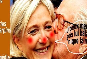 "Jean-Yves Camus dans Le monde[ii] écrit ceci : " Certains voient dans cette tension très forte entre deux lignes diamétralement opposées, celle de Marine Le Pen et celle de son père, un moyen délibéré pour la présidente du Front national de conserver l'électorat traditionnel tout en en gagnant un nouveau." Là d'accord pour l'analyse, car, d'une pierre deux coups: le vieux peut-être veut quitter la scène en grandes pompes et en foutant en apparence le binz bordélique; Tout en aidant sa fifille à glaner plus large: bien joués les artistes de la Commedia! Le Camus Jean-Yves conclue lui : " Mais il est toujours très aventureux de considérer que les gens tiennent un double langage." Soit il se fout de notre gueule soit le mec a avalé un tube de détartrant qui lui a siphonné le cervelas... Le double, triple quadruple langage est justement ça le FN ! Peuvent pas faire autrement, sinon, disparition presque immédiate. Alors on tartine dans Rivarol, on demande à poussah Gollnish de placer son bon mot pour la défense du tribun, pis, la Marine la ramène, pis le vieux gueule plus fort, puis le Philippot vice président en met une couche, pis la tiote Marion aussi son grain de rien, pis le mec de Marine, l'Aliot, pis le banc, l'arrière train du banc, les chaises, pis c'est au tour de la sœur ainée, pis... La saga, la saga LePenois! (Nous casse les noix); MAIS CA MARCHE !!! On entend plus parler que de ça depuis 3 jours; même moua, pourtant bien loin de m'intéresser à de telles créatures de non de dieu de crottes je m'y met, horreurs et damnations !