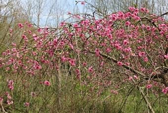 Prunus persica 'Lacrima' est encore plus fleuri que les années précédentes si cela est possible. Ce magnifique pêcher pleureur aux fleurs de grande taille en comparaison des autres pêchers vaut en beauté les arbres à fleurs et il donnera des pêches délicieuses. Il résiste bien à la cloque. S'il arrive parfois qu'il ait 2 ou 3 feuilles atteintes, je les enlève et c'est terminé.