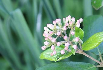 Dans ma frénésie de plantation de plantation j'ai oublié de l'étiqueter. C'est sa première floraison. Je pense qu'il s'agit de Viburnum x burkwoodii à cause de ses boutons roses, de ses fleurs blanches très parfumées, et surtout de son beau feuillage vernissé très persistant.