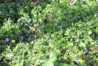 Vinca minor forme de vastes tapis où perce parfois la ficaire et où se sème le laurier-sauce :