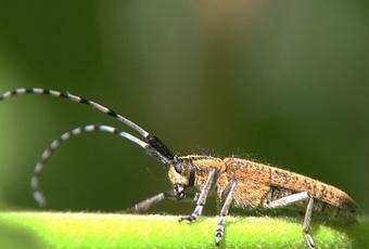 Son nom veut dire agapanthie à pilosité verdâtre. Mais elle est si petite qu'il est probable que je ne la remarquerais pas souvent sans ses immenses antennes noires et blanches aussi longues que le corps.