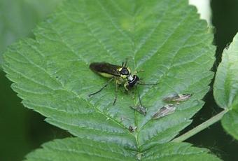 Encore une jolie bestiole. Je ne sais ce que c'est. Je pense à une tenthrède, peut-être Tenthredo mesomelas, qui termine la consommation d'une autre bestiole. On voit sur la feuille les ailes, non comestibles, de l'insecte dévoré :