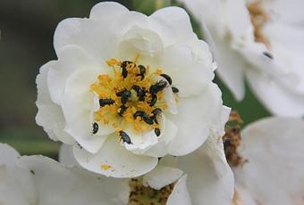 Depuis un mois, je vous ai montré des photos de roses dont le cœur était comme saupoudré de petits grains noirs. Ce sont de minuscules coléoptères, moins de 3mm, les méligèthes du colza, Meligethes aeneus. Il y en avait aussi sur les fleurs de seringat et les fleurs de Cornus kouza.