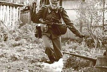 Cette image est pour le moins étrange : Un sous-officier de la Wehrmacht qui s’attaque à une poule armé de deux couteaux1 et d’un pistolet mitrailleur PPSH !