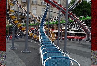 De loin, on peut penser à un genre de grand huit. De près, ce sont des chaises solidement fixées à une armature métallique, reliées à d’autres chaises : celles des terrasses des cafés de la place du Bouffay, à Nantes.