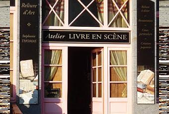 En face de la galerie L'ivre de l'art, il y a un des plus beaux intérieurs de Bécherel, l'atelier de reliure d'art traditionnelle "Livre en scène". Lors de mon dernier séjour à Bécherel, j'ai fait la connaissance de la relieuse Stéphanie Thomas, et visité en détail son espace de travail : les boiseries, les vitrages, la coursive qui couronne la pièce, les outils de la reliure, les cuirs, les papiers, la papeterie originale .... et les livres reliés. Ce lieu semble hors du temps et est pourtant bien vivant. Les objets, les outils, sont anciens mais sont encore employés au quotidien, dans leur usage premier.
