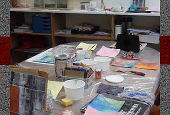 Fin de journée, chacun(e) a rangé son espace pour continuer demain: avancer sur les petits carrés 15x15 cm, enduire et mettre en couleur un leporello. Les objectifs du stage sont d'une part d'apprendre à préparer et enduire du papier, préparer et employer des pigments, expérimenter des encres pigmentées et à base de gomme laque, et d'autre part d'aborder des notions de composition et de mise en page. L'optique étant le travail de la matière.