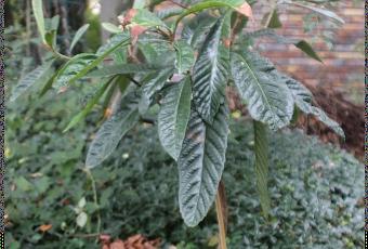 Mon jeune Eriobotrya japonica ‘Oliver’ n’a qu’un an. Il a grandi même en hiver. Aujourd’hui je découvre plein sud donc côté limite du jardin et cachée par les grandes feuilles une jolie grappe de boutons floraux. Elle doit être là depuis pas mal de jours car elle en est au même stade que les grappes du grand néflier. La grande fleur jaune à son pied est une fleur de la courge spaghetti exubérante qui déborde de partout, a fleuri abondamment tout l’été et encore maintenant mais n’a pas donné un seul fruit.