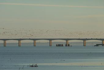 C’est toujours la même histoire : un ciel définitivement bleu, des températures refusant de descendre en dessous de 20°C en pleine journée, et pourtant l’hiver se pointe inexorablement. Dans les bois, il n’y a plus de nonnettes mais les chanterelles sont bien là, c’est bien un signe d’hiver, ça. Nous avons vu les grues au-dessus du jardin, cap au sud en criant bien fort. Les cygnes ont pris leurs quartiers d’hiver sur le bassin d’Arcachon, et il nous est même arrivé, en bons petits vieux, de faire un feu dans la cheminée, c’est dire à quel point l’hiver est proche. Il ne nous manquait qu’un indice : les bernaches cravants, qui hivernent chaque année dans le coin. Et les petites oies, les plus petites des oies bernaches, se sont pointées, tournoyant au-dessus du viaduc d’Oléron :