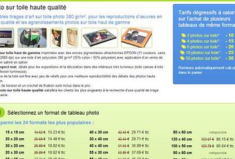 Sur le site toile impression tout est très clair. Dans la partie « Photo sur toile », tu trouves directement un tableau avec les différentes tailles et les prix en face. Donc pas de mauvaise surprise à la fin de ta commande.