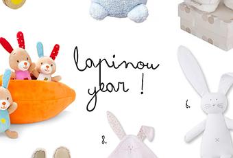 1 – Lapin à promener Roulapic Djeco | 13.00€ – 2 – Doudou ange lapin bleu 12cm Trousselier | 14.00€ – 3 – Famille lapins chocolat Sylvanian | 24.99€ (Dès 3 ans) – 4 – Coffret chaussons lapins Bonbon | 22.90€ – 5 – Maison carotte Fil le lapin Oxybul | 19.00€ – - 6 – Doudou Lapin blanc Petit Bateau | 19.00€ – 7 – Porteur lapin Moulin Roty | 129.00€ – 8 – Doudou plat rayé lapin Petit Bateau | 15.00€ – 9 – Boite à musique ange lapin rose Trousselier | 25.90€