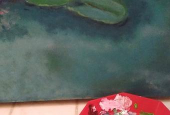 Mon premier atelier créatif 2016? C'est avec de la couleur, une éponge, des pinceaux, des rêves de fleurs, des rêves d'eau, du bleu en camaïeu, de l'émeraude, un voyage, un parfum d'Asie le tout pour un décor en trompe-l'oeil.