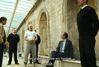 Mais si je tiens tant à évoquer ce film, c'est parce qu'il évoque lui-même le peintre cité ici dernièrement, à savoir René Magritte. Bronson a en effet découvert l'art en prison, et il est même devenu un artiste reconnu ; Winding Refn brode sur ce thème avec l'épisode (réel) d'une prise d'otage de son prof d'arts plastiques. A partir de là, la scène est complètement inventée, on y voit Bronson, nu et enduit de cirage noir, transformer le prof en reproduction du célèbre tableau magrittien, Le Fils de l'homme.