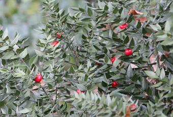 Le fragon petit houx, bien plus piquant que le houx, est une nourriture pour les oiseaux qui disséminent ses graines. Pourtant ce pied femelle a encore toutes ses boules en fin d’hiver :